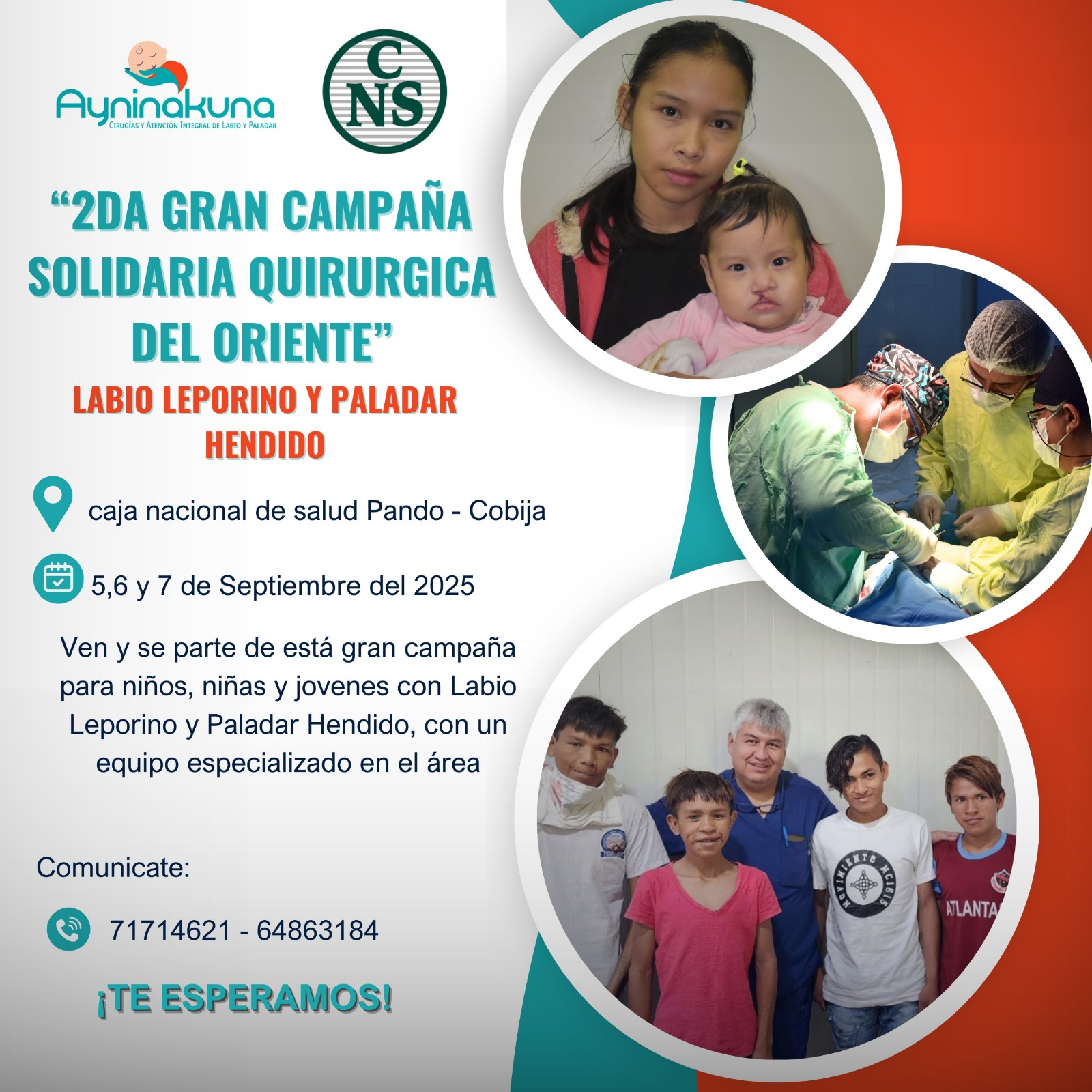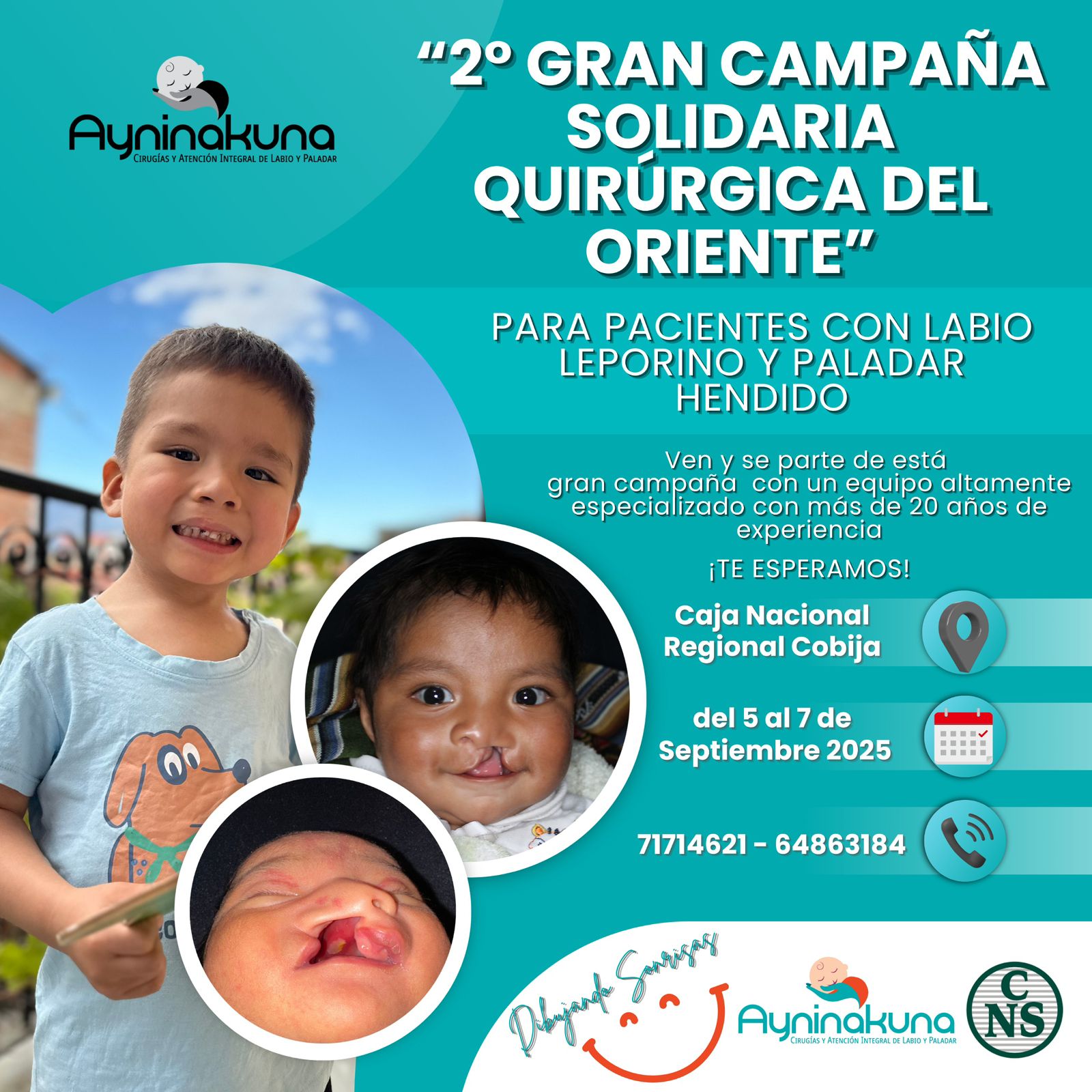 <p>La Fundación para la Salud Ayninakuna y la Caja Nacional Regional Cobija te invitan a la 2º Gran Campaña Solidaria Quirúrgica del Oriente para pacientes con labio leporino y paladar hendido.<br />Ven y sé parte de esta gran misión junto a un equipo altamente especializado con más de 20 años de experiencia, comprometido en devolver sonrisas y esperanza a nuestras familias.<br /> Lugar: Caja Nacional Regional Cobija<br /> Fecha: 5 al 7 de septiembre de 2025<br />Contactos: 71714621 – 64863184<br />Porque juntos dibujamos sonrisas y cambiamos vidas</p>