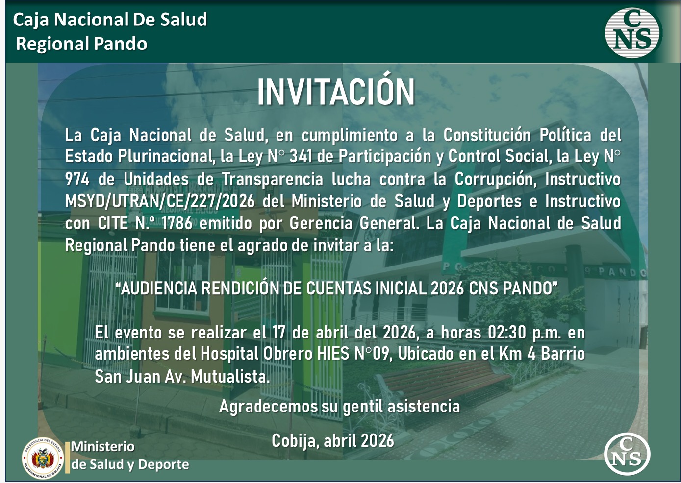 <p style="text-align: justify;">La Caja Nacional de Salud, en cumplimiento a la Constitución Política del Estado Plurinacional, la Ley N° 341 de Participación y Control Social, la Ley N° 974 de Unidades de Transparencia lucha contra la Corrupción, Instructivo MSYD/UTRAN/CE/227/2026 del Ministerio de Salud y Deportes e Instructivo con CITE N.º 1786 emitido por Gerencia General. La Caja Nacional de Salud Regional Pando tiene el agrado de invitar a la:</p>