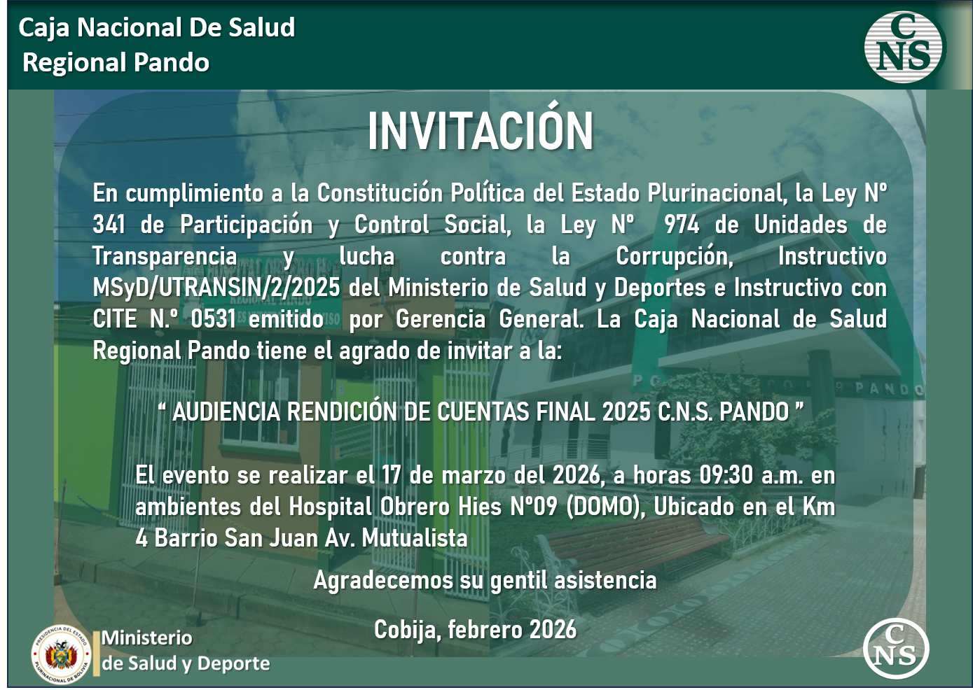 <p style="text-align: justify;">En cumplimiento a la Constitución Política del Estado Plurinacional, la Ley Nº 341 de Participación y Control Social, la Ley Nº 974 de Unidades de Transparencia y lucha contra la Corrupción, Instructivo MSyD/UTRANSIN/2/2025 del Ministerio de Salud y Deportes e Instructivo con CITE N.º 0531 emitido por Gerencia General. La Caja Nacional de Salud Regional Pando tiene el agrado de invitar a la: </p>